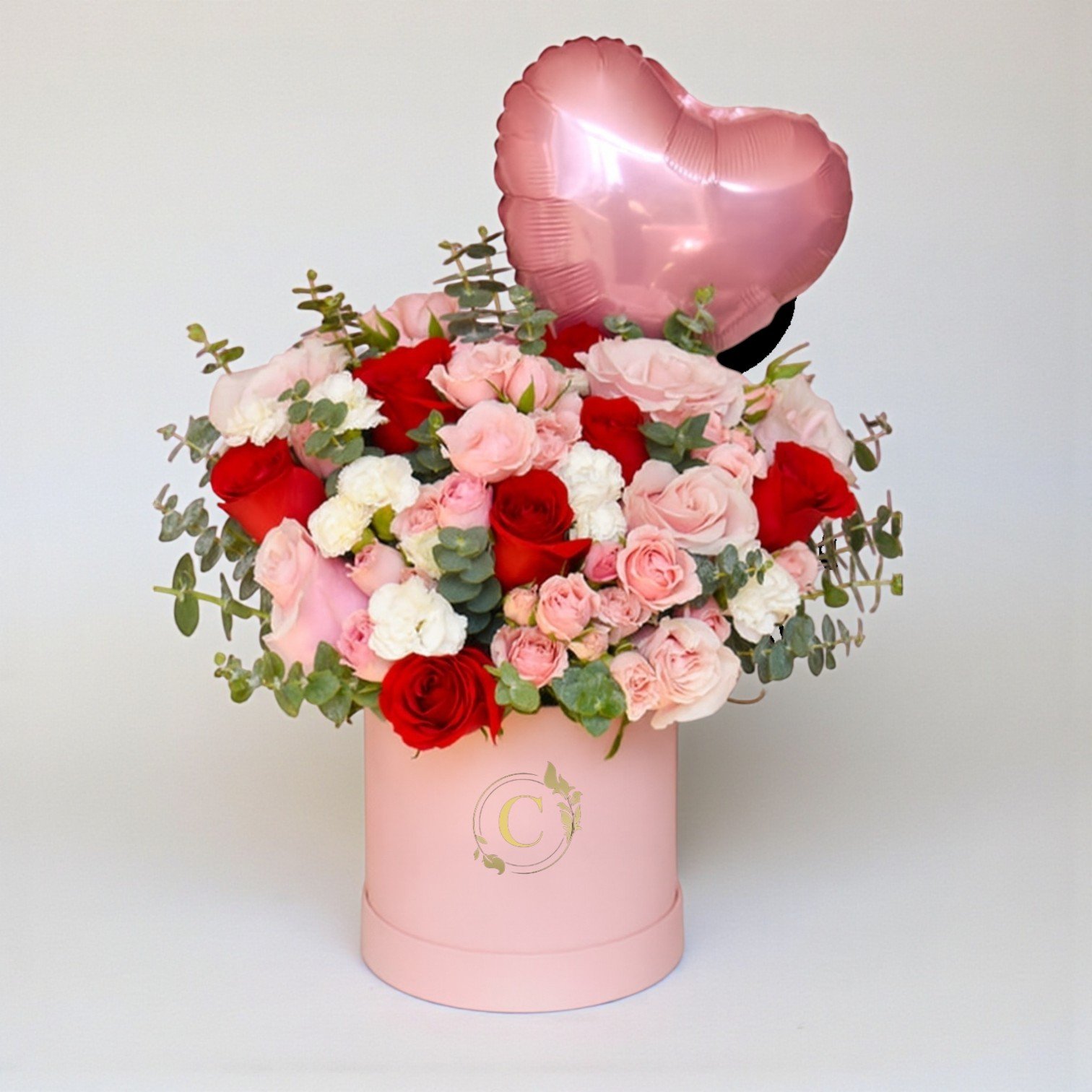 Delicada caja rosada con un mix de flores según estación. Ideal para un regalo romántico lleno armonía de rosas y mucho amor.