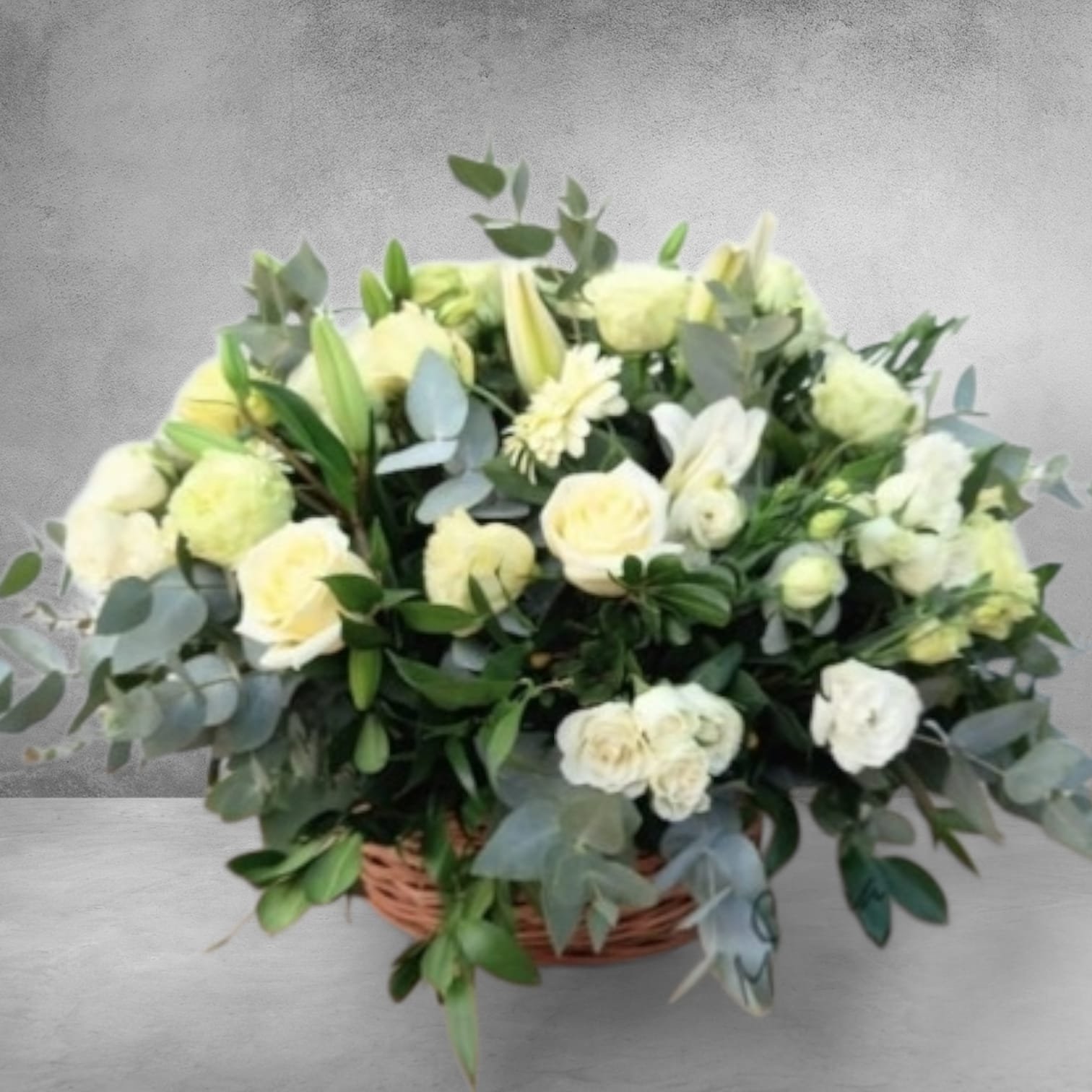 Una composición en tonos blancos y marfil con rosas, lirios, gerberas y follaje fresco, presentada en canasto tejido. Ideal para transmitir serenidad, gratitud o acompañar momentos significativos con sobriedad y armonía.
