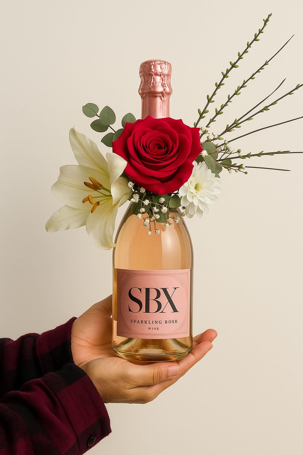 Una celebración que florece. Esta botella de espumante rosé SBX se transforma en una escena de regalo inolvidable gracias a su delicado arreglo floral, diseñado para transmitir elegancia y emoción.