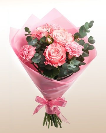 Una composición delicada con 3 rosas rosadas y 3 claveles rosados, acompañadas de eucalipto fresco y envueltas en papel rosa con lazo a tono. Un gesto romántico y elegante, ideal para celebrar momentos especiales con dulzura y estilo.