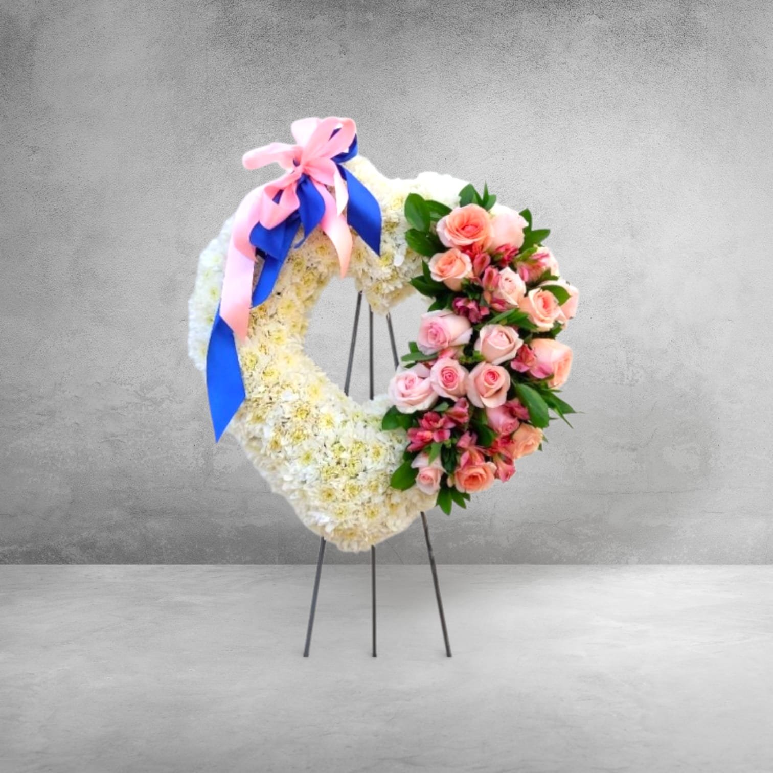 Una composición con flores blancas y rosas que transmite amor, respeto y memoria. Diseñada en forma de corazón, con detalles de follaje y lazo decorativo, esta corona es ideal para homenajes emotivos y despedidas significativas.